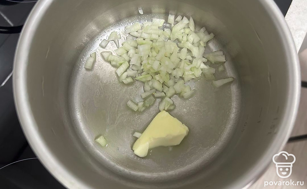 Лук нарежьте кубиком. Обжарьте в сотейнике на сливочном масле в течение 2-3 минут.