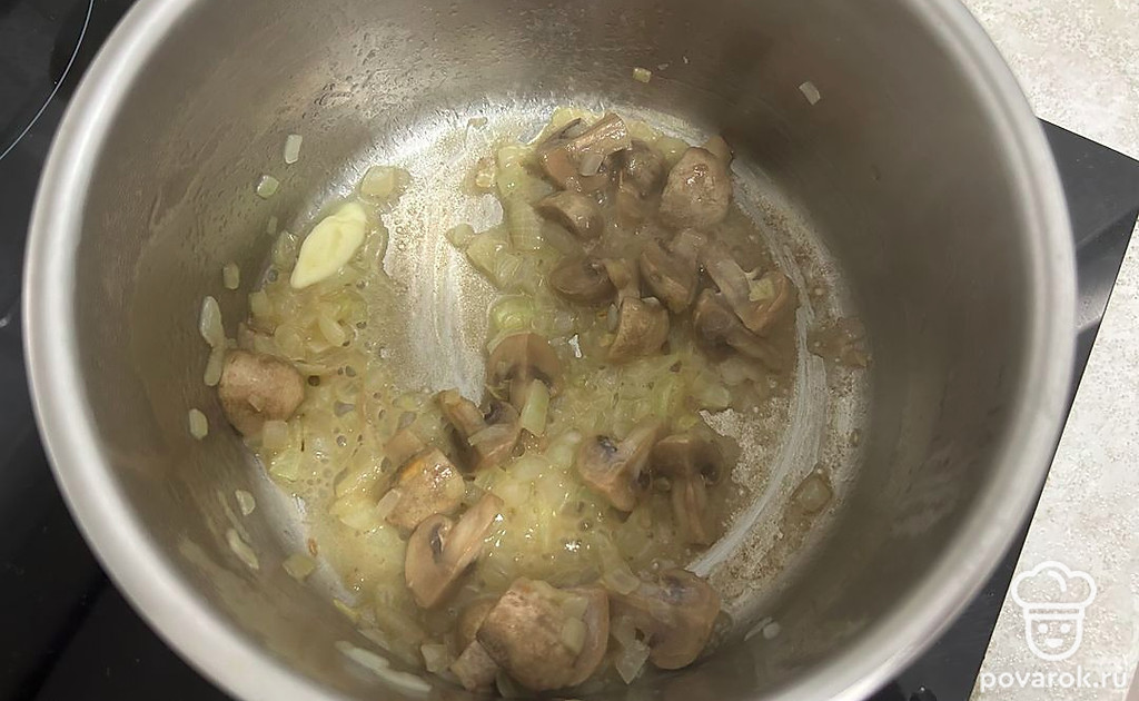 Шампиньоны разрежьте на четвертинки. Обжарьте вместе с луком еще 5 минут.