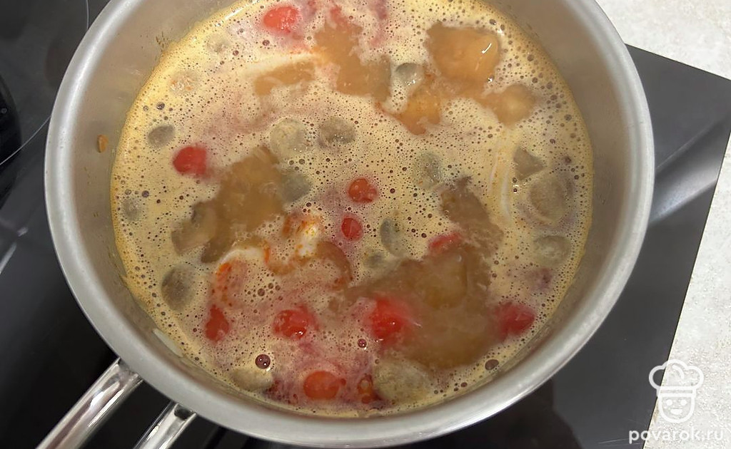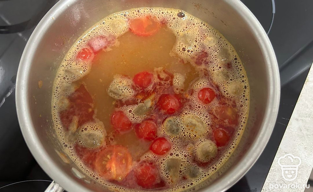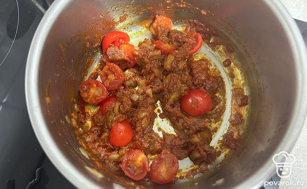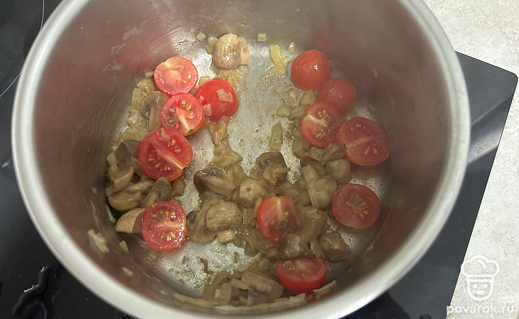 Помидоры разрежьте пополам. Томите в сотейнике 2 минуты.