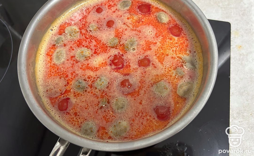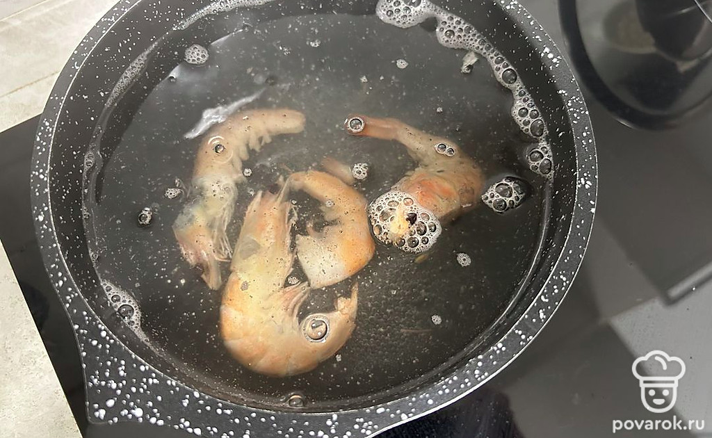 В сотейник через сито добавьте воду, в которой варились креветки. Доведите до кипения.