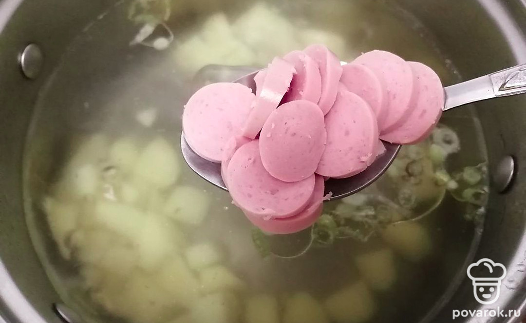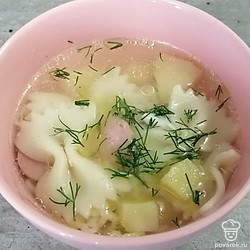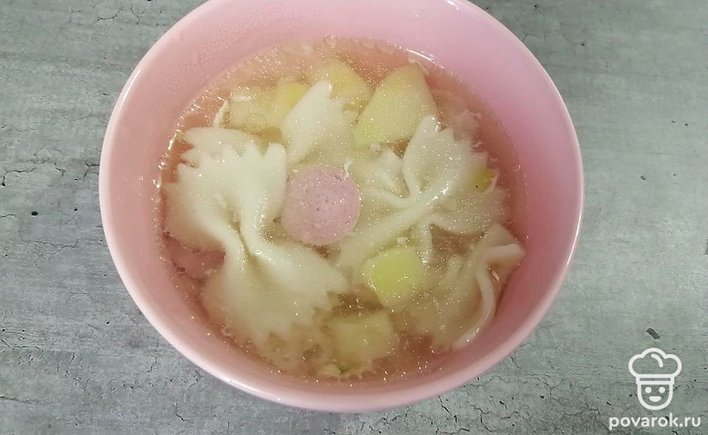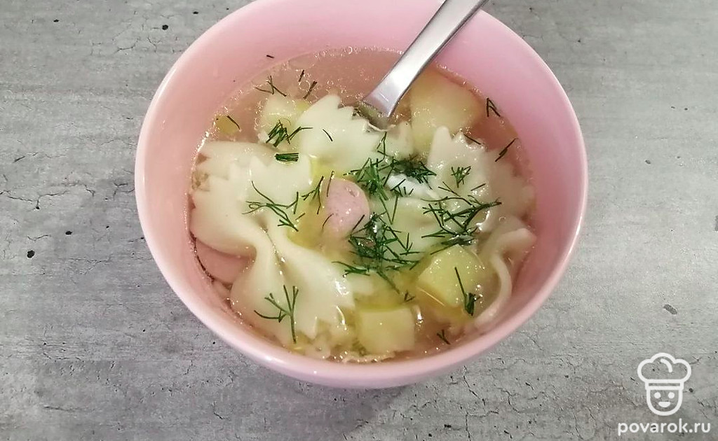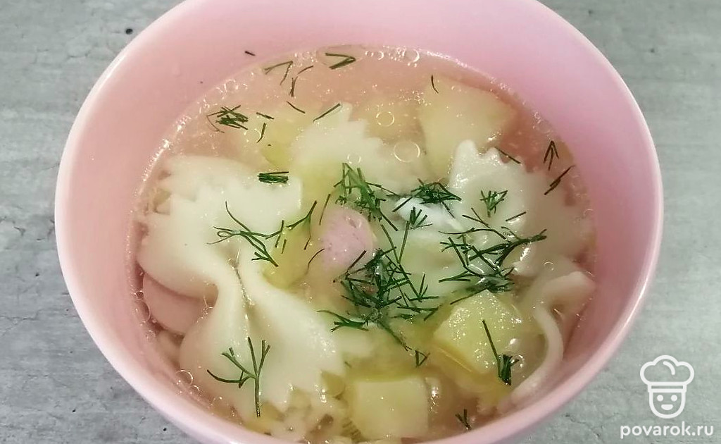 Легкий супчик с яйцом и сосисками. Эффектно смотрится с макаронами-бабочками.