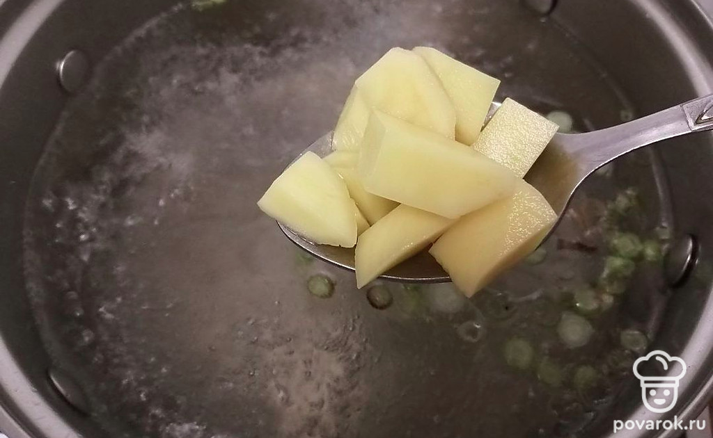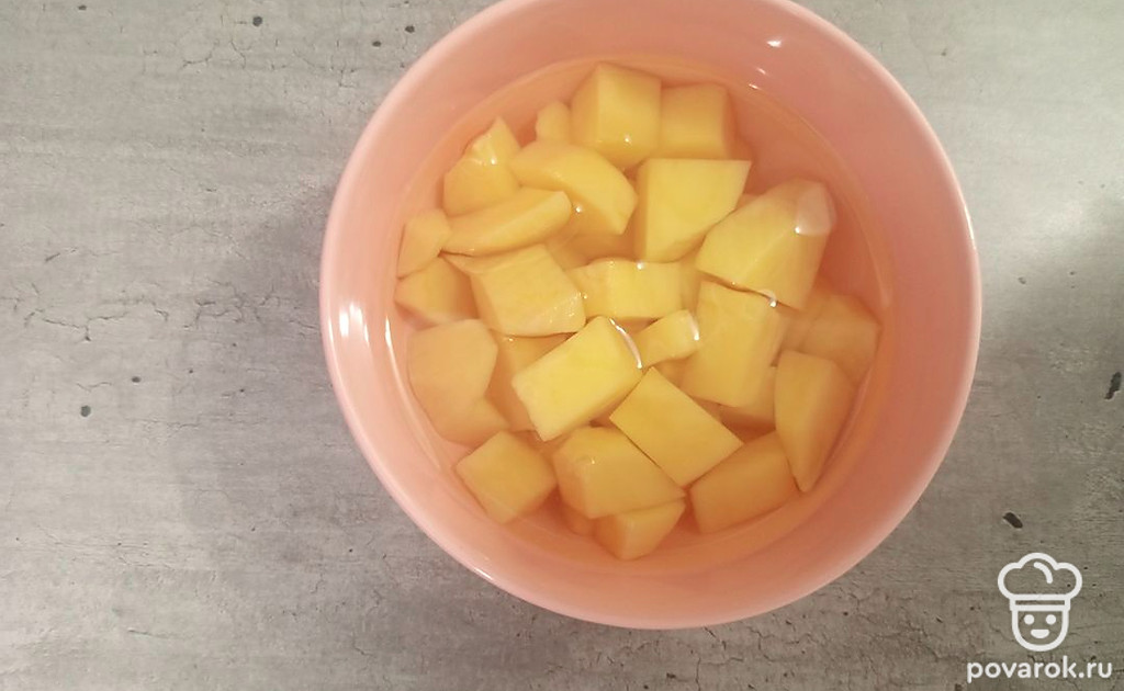 В кастрюлю налейте холодную воду. Когда вода закипит, добавьте картошку.