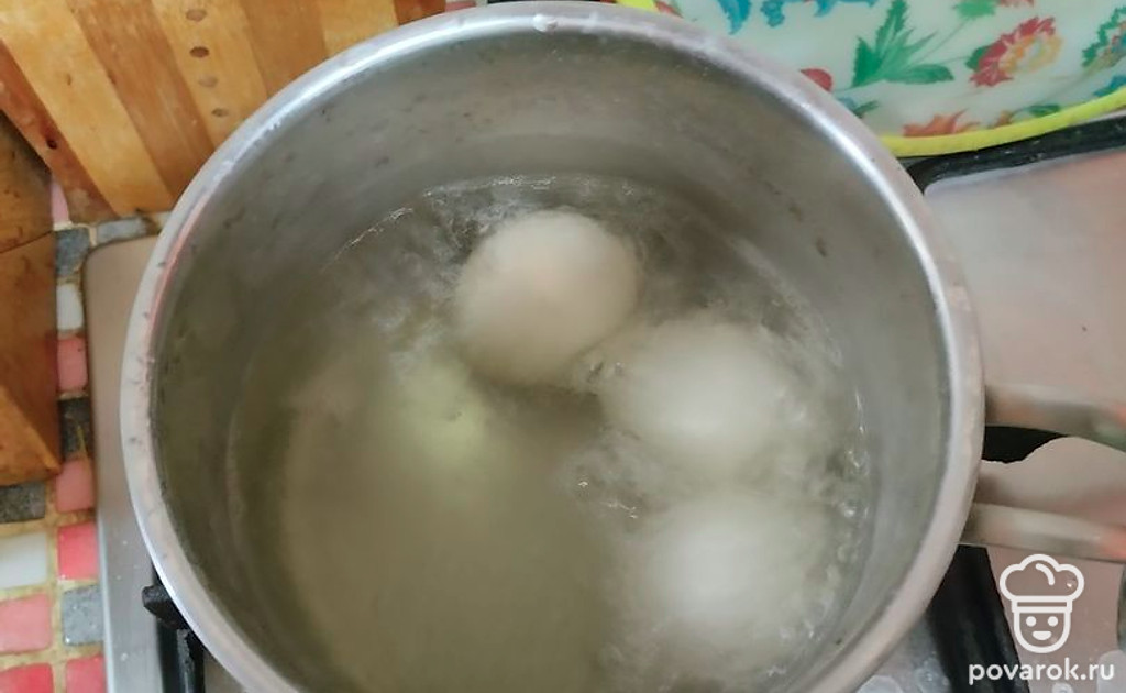 Куриные яйца отварите в течение 12-15 минут, остудите, почистите.