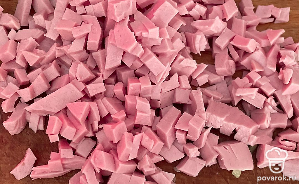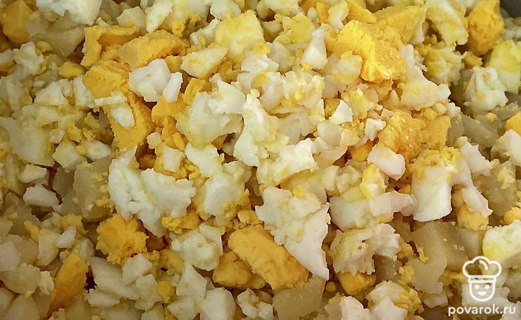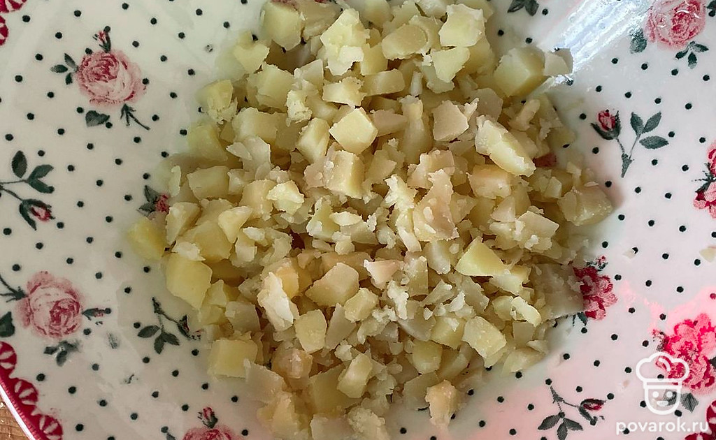 Картофель и яйца предварительно отварите. Освободите картофель от кожуры и нарежьте кубиком.