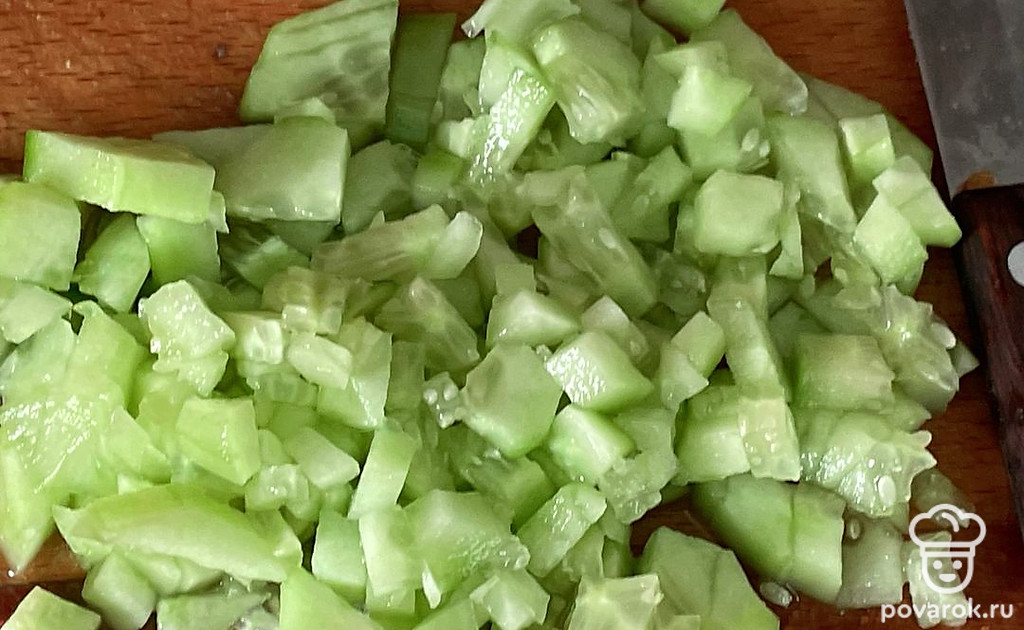 Огурец мелко нарежьте, можно снять с огурца кожицу.