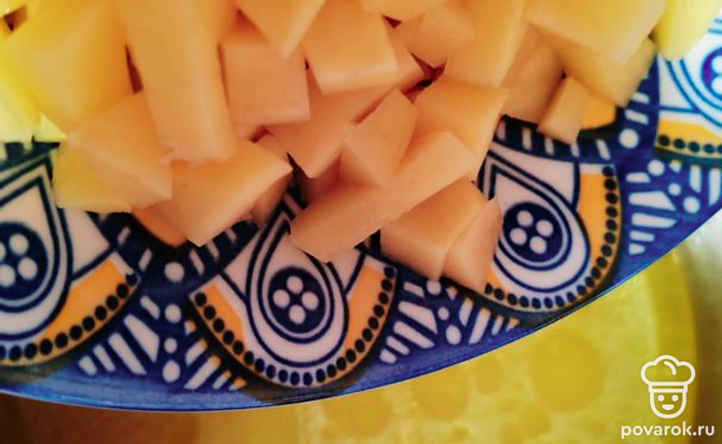В готовый куриный бульон всыпьте нарезанную мелким кубиком картошку.