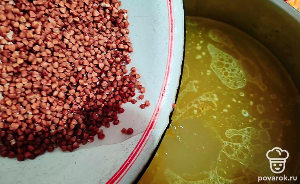 Гречку помойте и всыпьте в бульон.