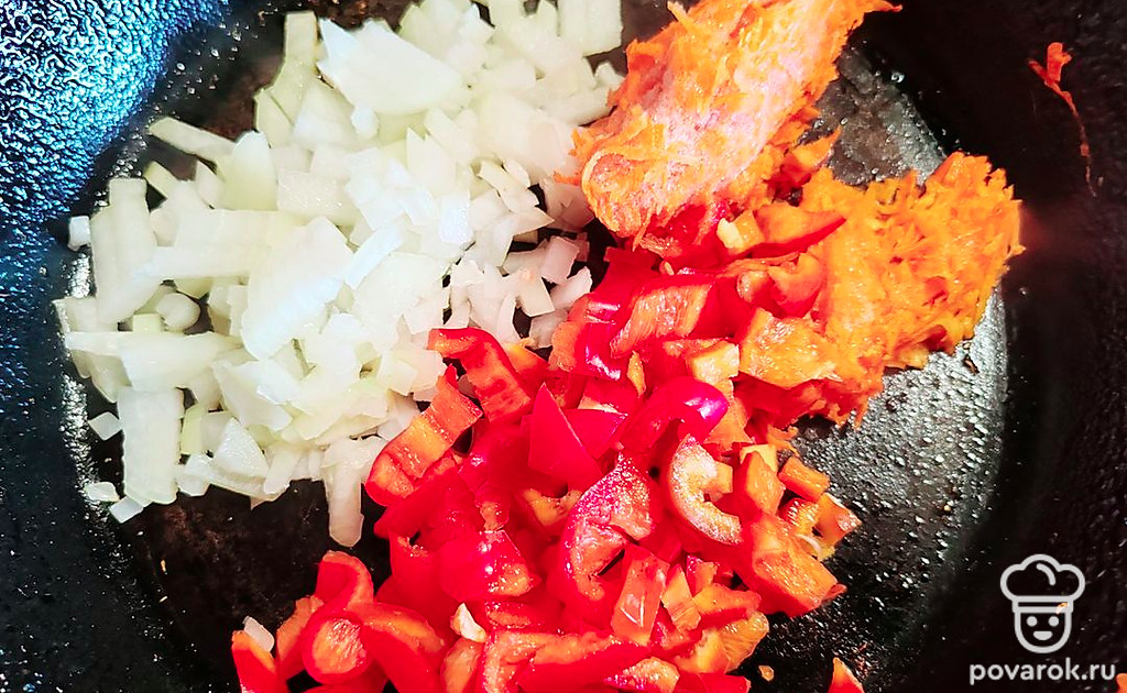 На сковороде с чесночным маслом обжарьте нарезанные овощи (лук, перец и морковь).