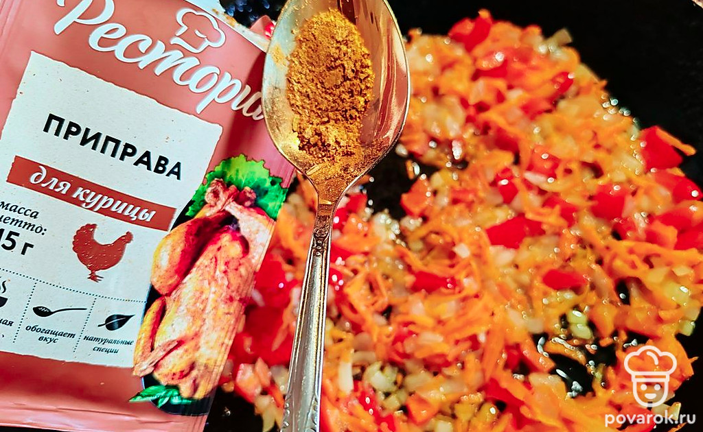 В зажарку добавьте приправу для курицы. Перемешайте все, тушите 1-2 минуты.