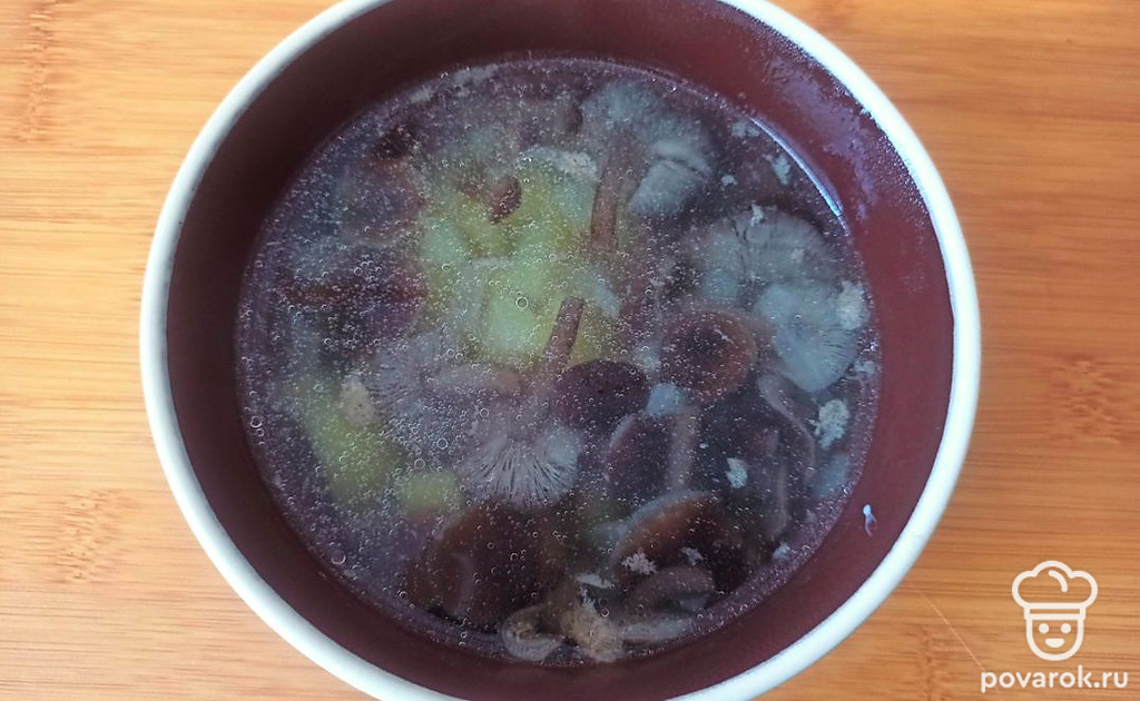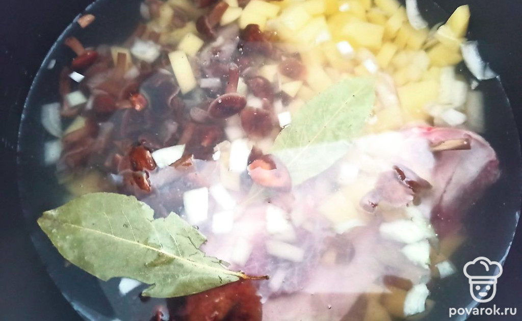 Залейте водой, добавьте лавровый лист и соль. Перемешайте.
