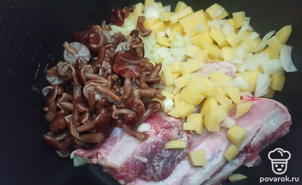 Выложите в чашу мультиварки ребрышки, картофель, лук и грибы.