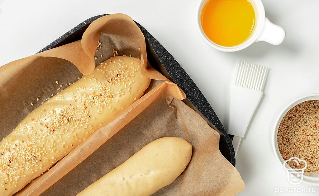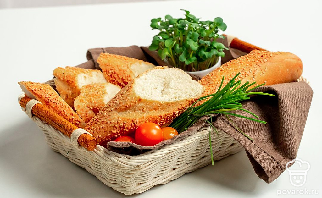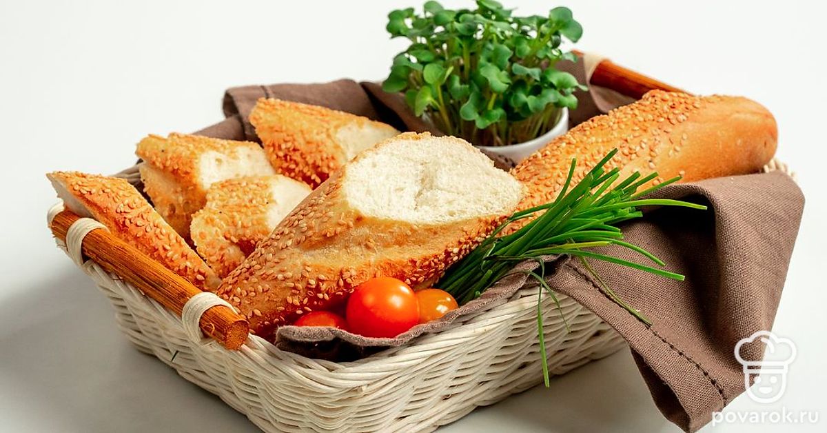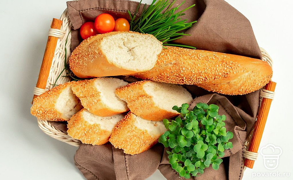 Багет, приготовленный в домашних условиях, не только вкуснее, но и полезнее магазинного продукта. В его состав входит большое количество витаминов и минералов. Магний, цинк и калий являются лишь малой частью всех ценных веществ, содержащихся в хлебе. Кроме того, багет рекомендуется употреблять людям с больным сердцем или плохим зрением. А кунжутные семена помогают ускорить метаболизм, укрепить иммунитет и обеспечить суточную норму кальция в организме.