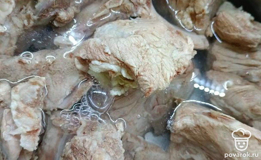 Как только вода в кастрюле закипит, сливаем первую воду. Мясо ополаскиваем и кладем опять в кастрюлю. Наливаем воду и уже варим до готовности примерно 1 час.