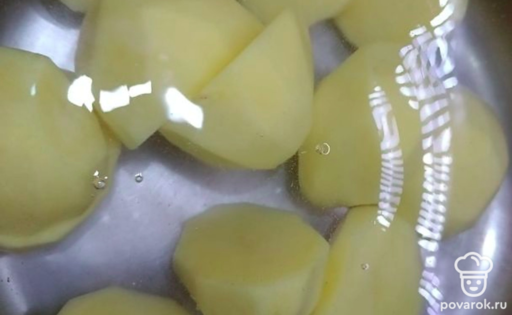 Очищаем картофель и кладем его варить в кастрюлю с мясом.