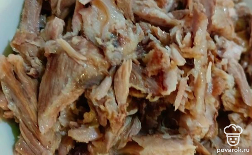 Когда мясо у нас будет готово, его необходимо немного остудить и отделить от косточек.