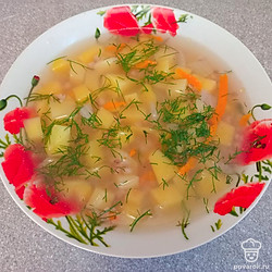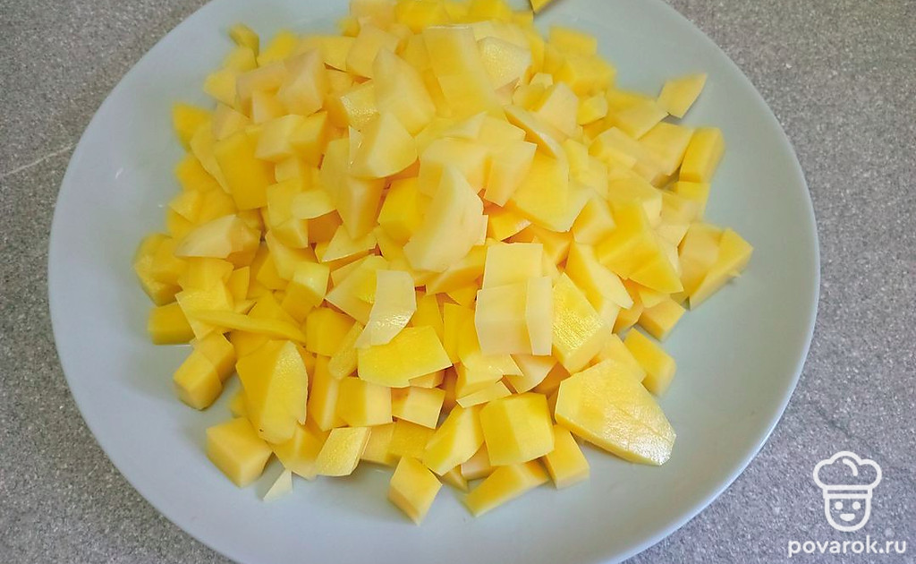 В мясной бульон положите нарезанный кубиками картофель. Варите 5 минут.
