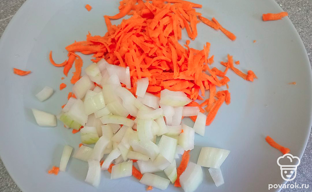 Добавьте нарезанный мелкими кубиками репчатый лук и натертую на крупной терке морковь.