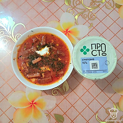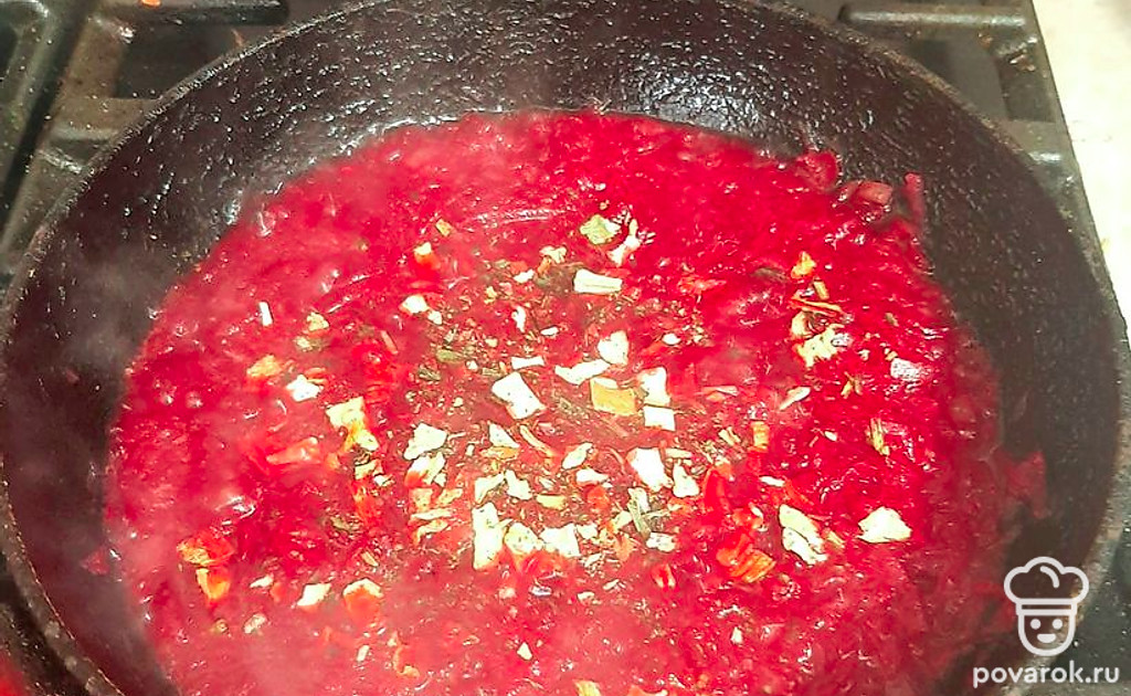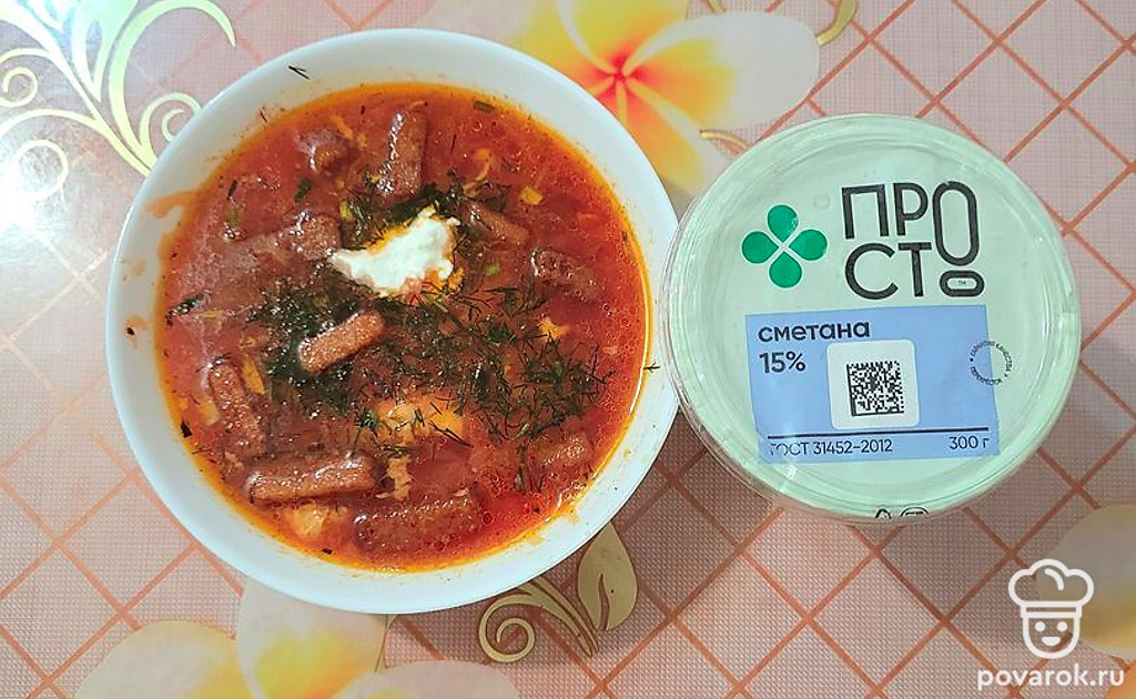 Готовый борщ разлить по тарелкам. Подавать к столу со сметаной и гренками.