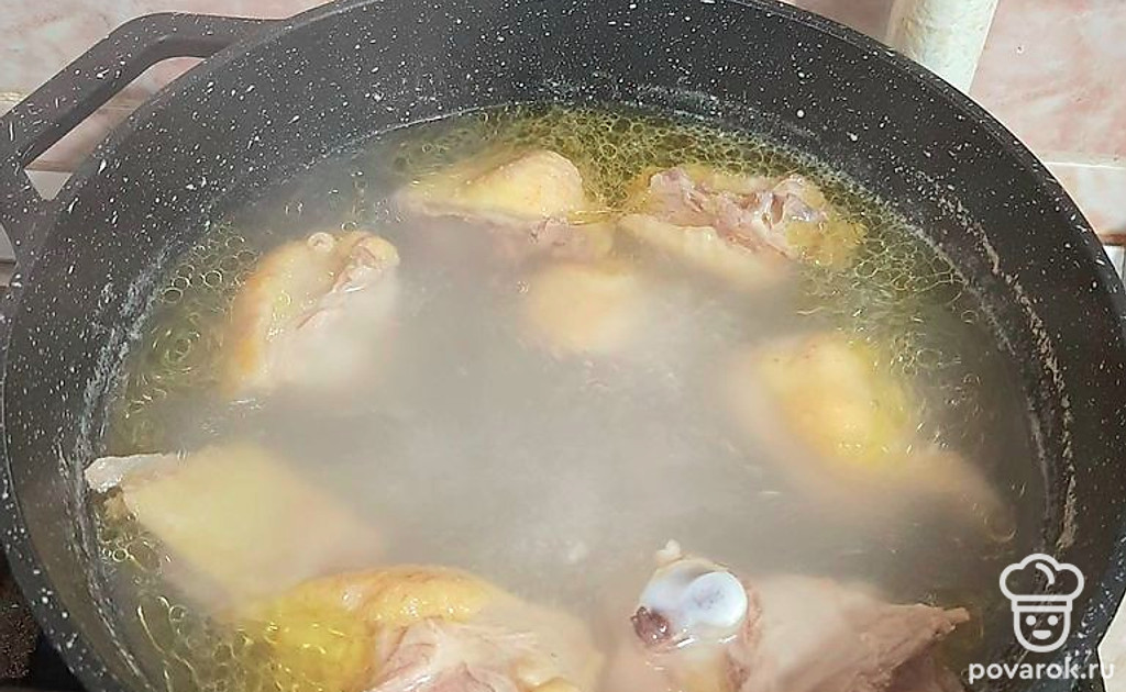 Голени индейки разделать. Отправить в кастрюлю, довести до кипения, посолить. Снять образовавшуюся пену, варить 30 минут.
