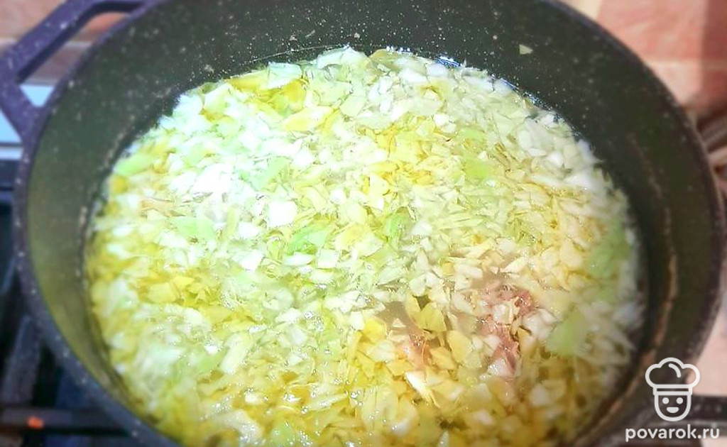 Молодую капусту мелко нашинковать, добавить в кастрюлю к мясу.