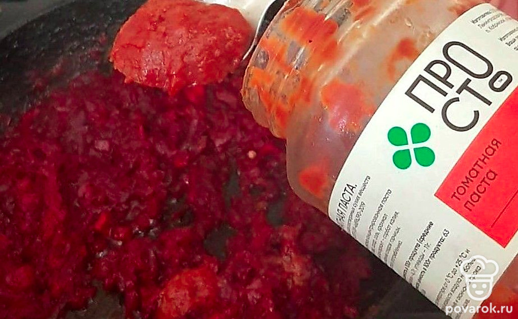 Добавить в овощную зажарку томатную пасту и воду. Тушить все вместе 5-7 минут.