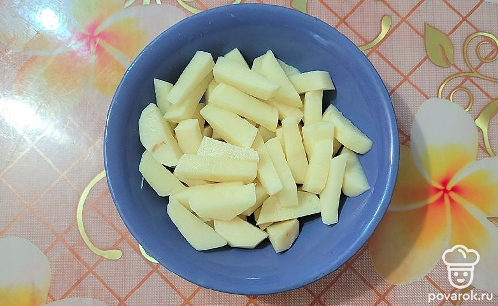Картошку нарезать небольшими брусочками. Выложить в кастрюлю к остальным ингредиентам.