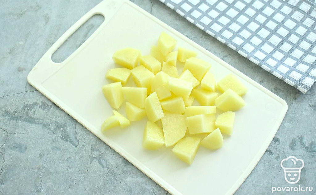 Нарежьте картофель средними кубиками и отправьте в кипящий бульон.