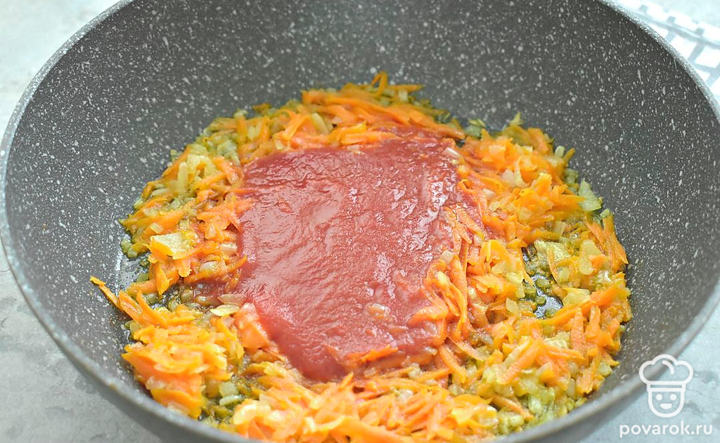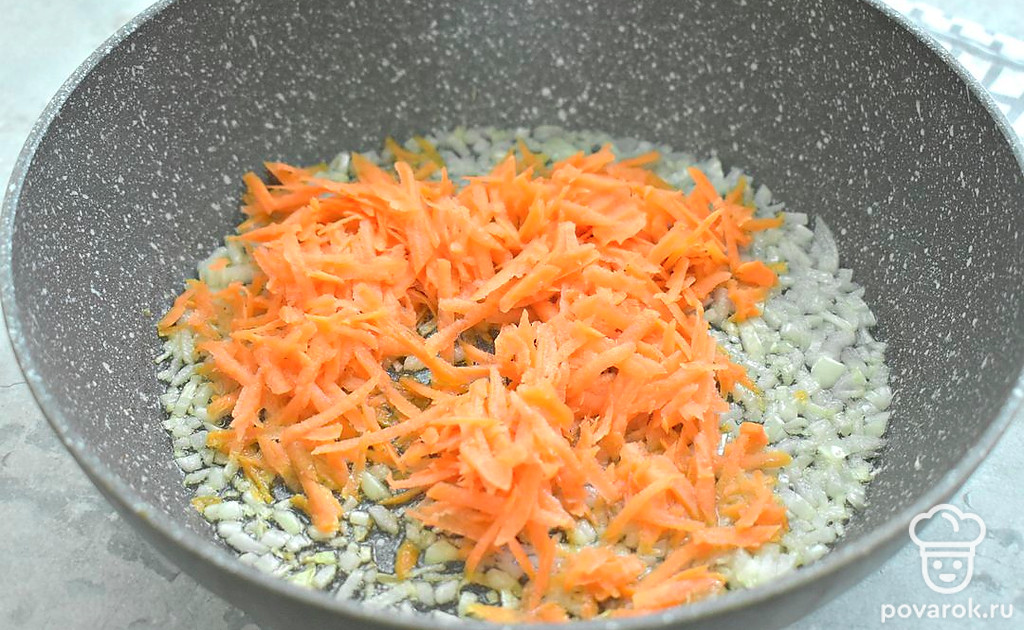 Нарежьте лук и обжарьте в растительном масле 2-3 минуты. Добавьте к луку тертую морковь, перемешайте. Продолжайте обжаривать 3-4 минуты.