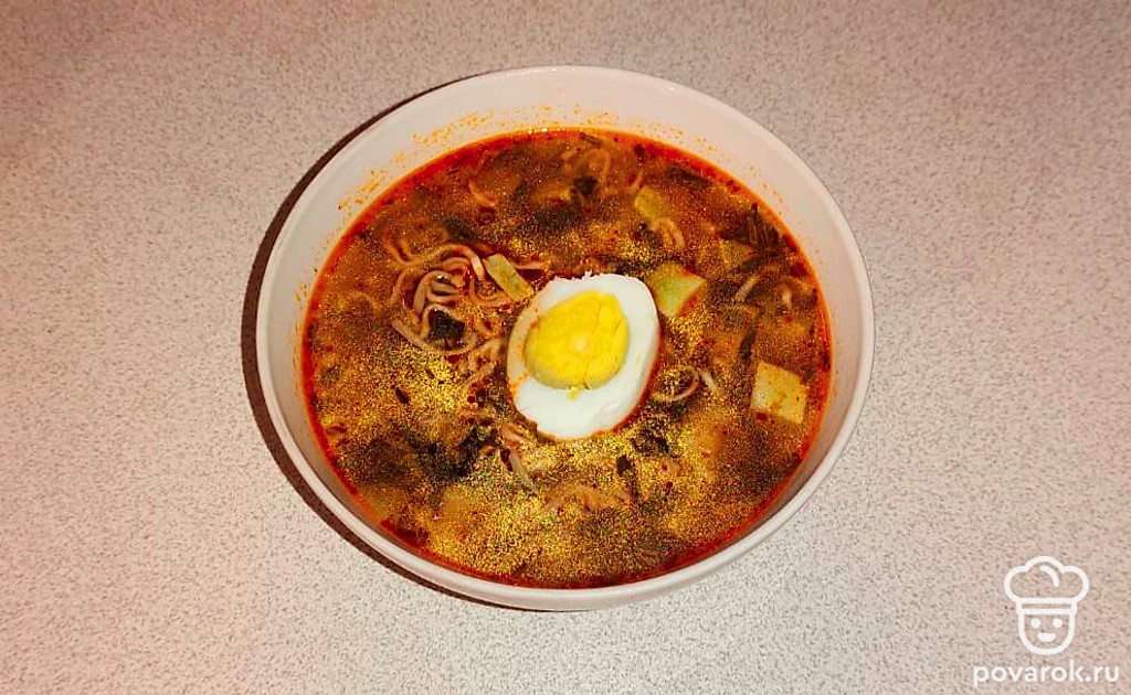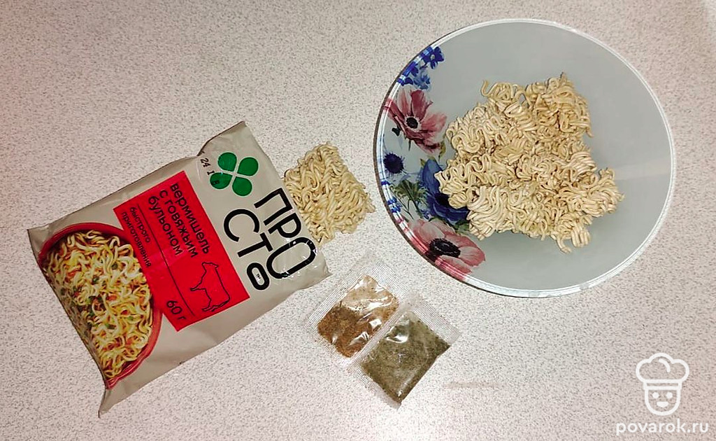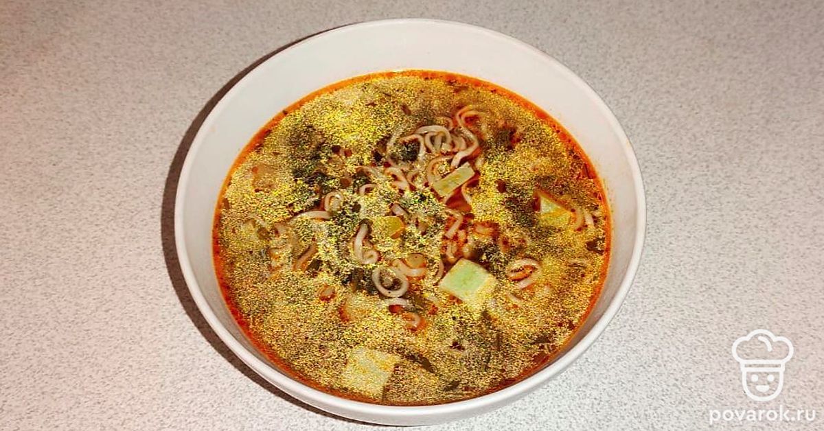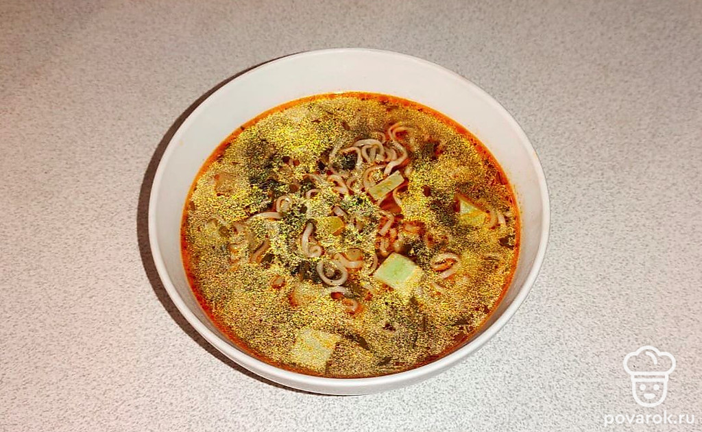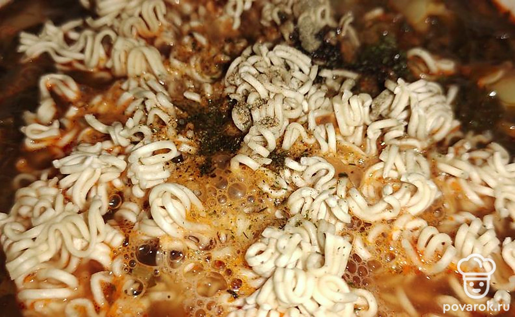 Вермишель и специи из упаковки добавьте в суп, доведите до кипения. Снимите с огня, оставьте на 3 минуты, Подавайте к столу. Приятного аппетита!