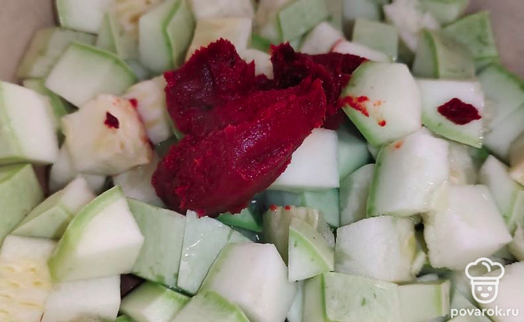 Кабачок с добавлением оливкового масла и томатной пастой обжарьте в толстостенной кастрюле.