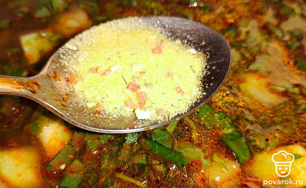 Добавьте в кастрюлю воду, щавель и универсальную приправу. Перемешайте, доведите до кипения.