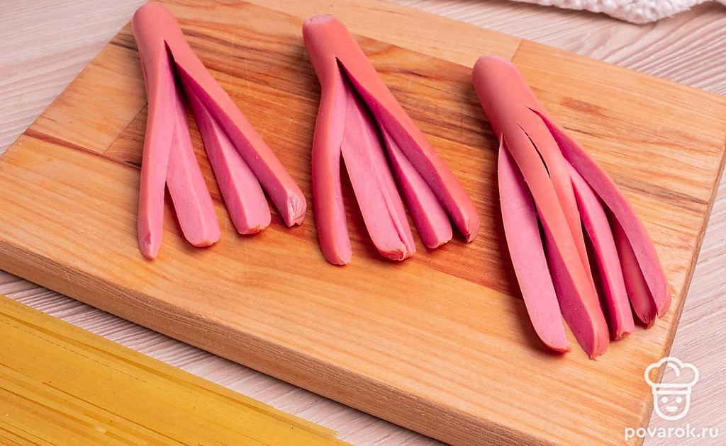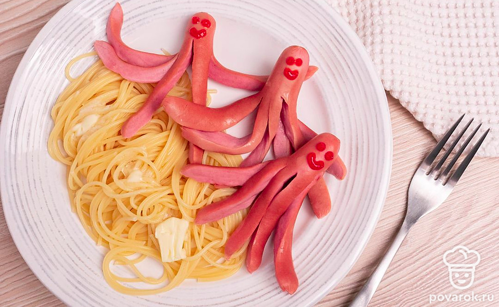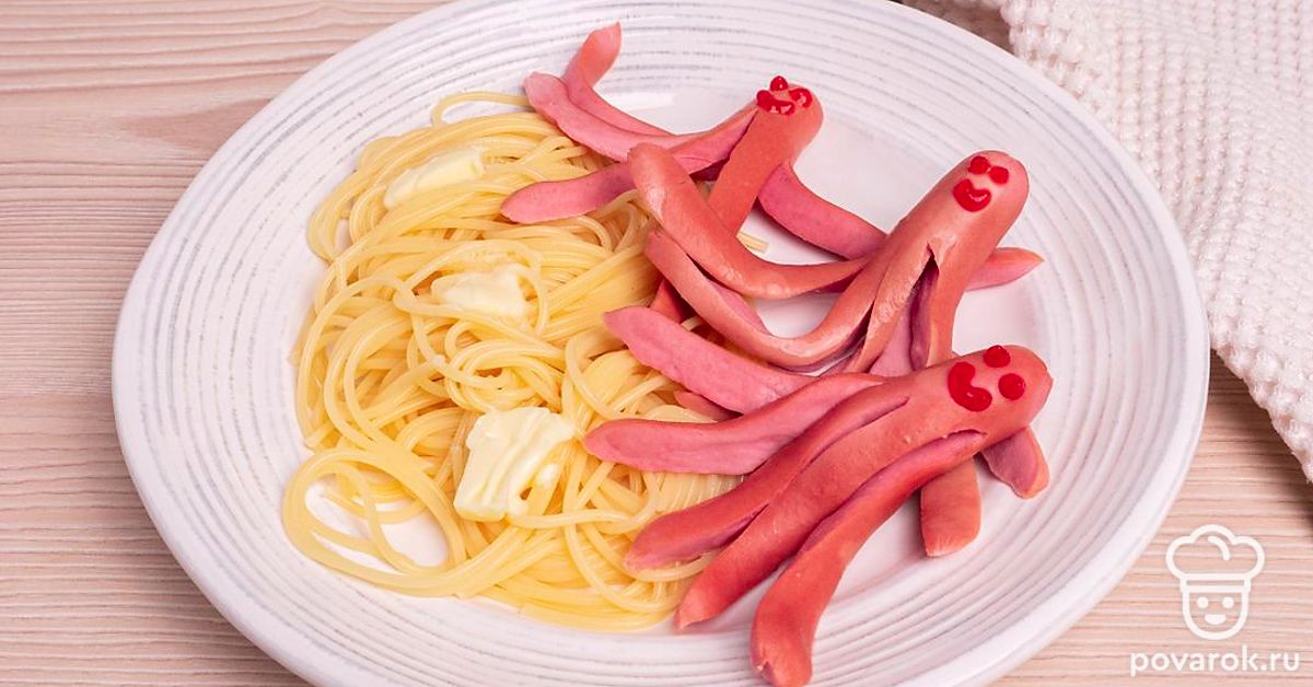 Яркий и интересный вариант обеда или ужина для детей. Если ваши малыши особые привереды, мимо таких веселых осьминожек они точно не смогут пройти. Блюдо готовится очень быстро, в приготовлении используются обычные, доступные каждому, ингредиенты. Приготовить такое блюдо вы можете вместе с детьми, им будет интересно поучаствовать в готовке.