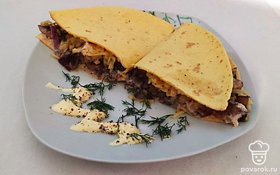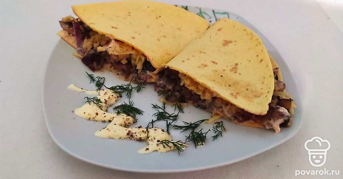 Обязательно попробуйте эту тонкую лепешку тортилью с натертым сыром и грибной начинкой. Это невероятно вкусное блюдо мексиканской кухни предназначено для быстрого перекуса или завтрака. Кроме этого, такую тортилью с грибами можете смело брать с собой на пикник и на работу. Хорошо нагретый сыр в начинке склеит все ингредиенты и не даст им выпасть. Поэтому удобно тортилью не только готовить, но и есть.