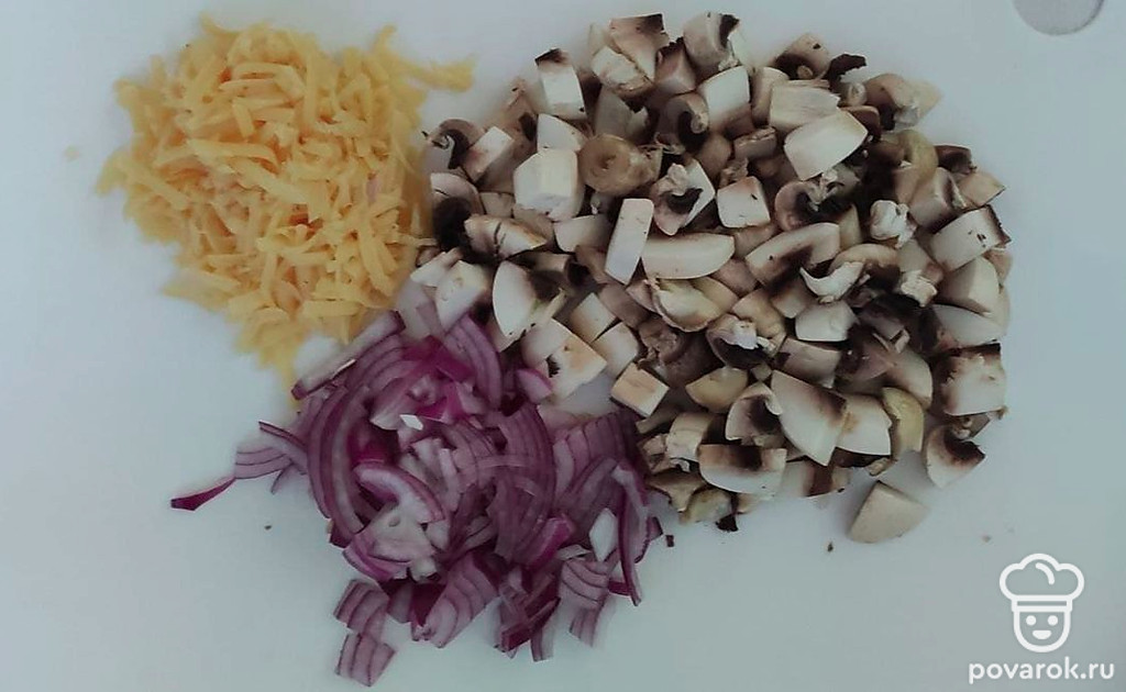 В отдельную емкость нарежьте мелкими кубиками лук и грибы, так же чтобы сыр плавился быстрее натрите его на крупной терке.