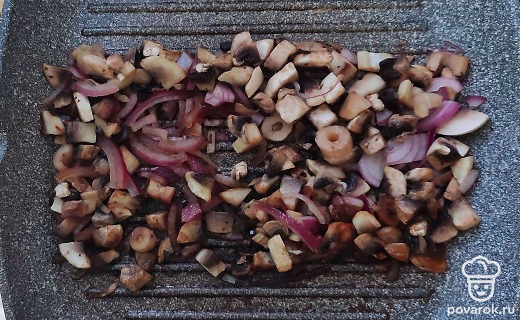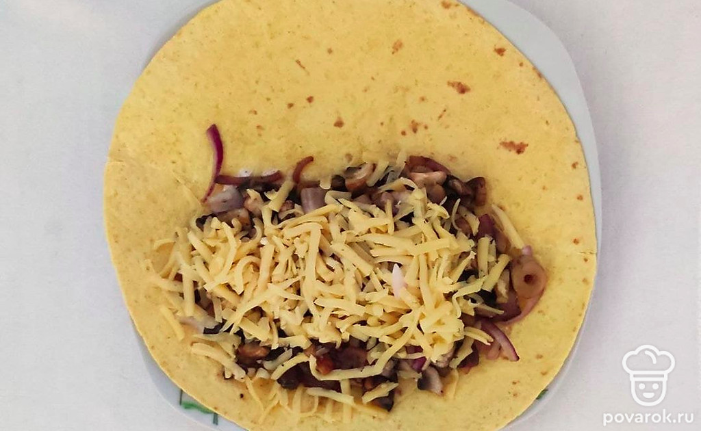 На тарелке разложите тортилью, на одну половину выложите половину сыра, поверх лук и грибы, засыпьте оставшимся сыром. Сложите по полам, прожарьте на сковороде 2-3 минуты с каждой стороны.