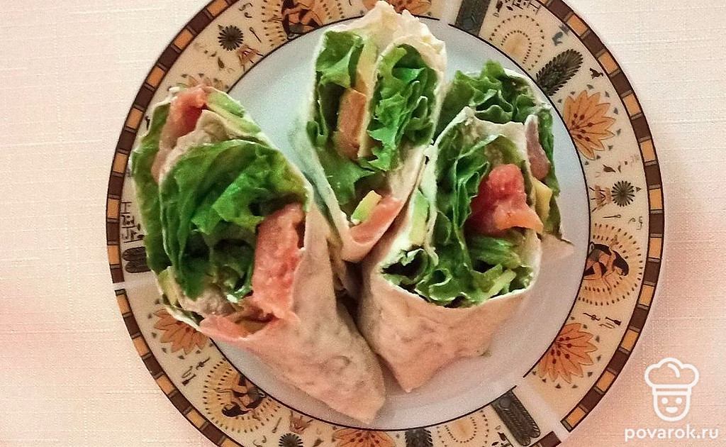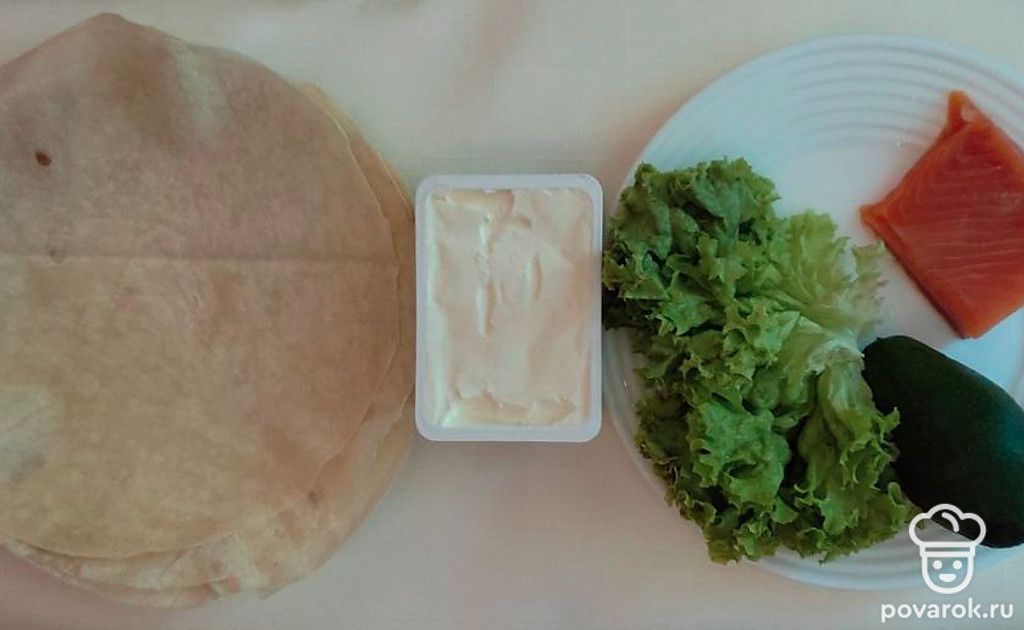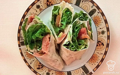 На тортилью, либо лаваш намажьте слой сливочного сыра, сверху выложите слой из листьев салата. Тонко нарежьте рыбу, и также выложите ее на лаваш.