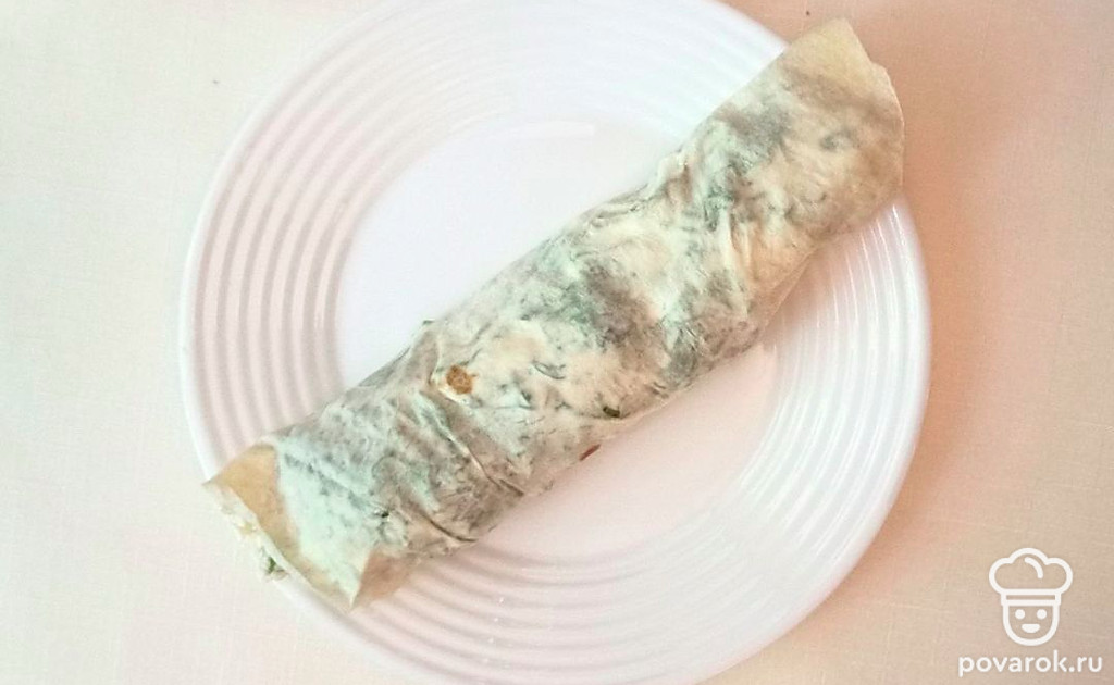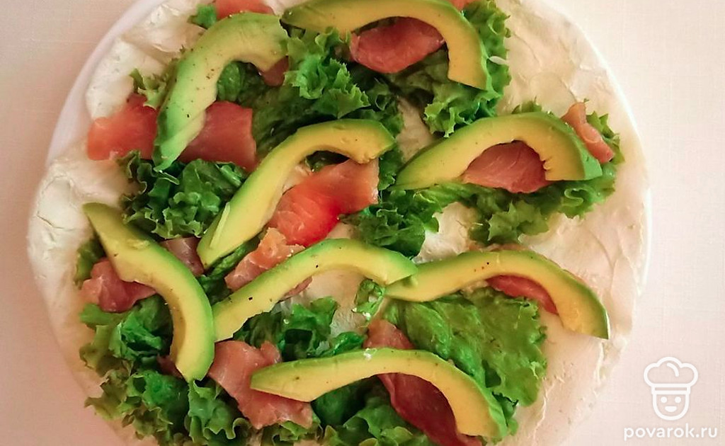 Порежьте авокадо также, как и рыбу, и посыпьте сверху. Затем аккуратно заверните тортилью в форме рулета, при желании нарежьте на порционные куски.