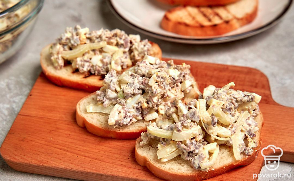 Тосты с соусом из куриных желудков ― отличный способ разнообразить меню. Хрустящий хлеб прекрасно сочетается с мягкой солоноватой массой, дополненной кисловатым луком. Стоит учитывать, что желудки представляют собой жесткую мышечную массу, поэтому им нужна долгая термическая обработка. Куриные желудки обладают низкой калорийностью и считаются диетическими. В них содержится железо, селен, фосфор, цинк, витамины А, Е, С и группы В.