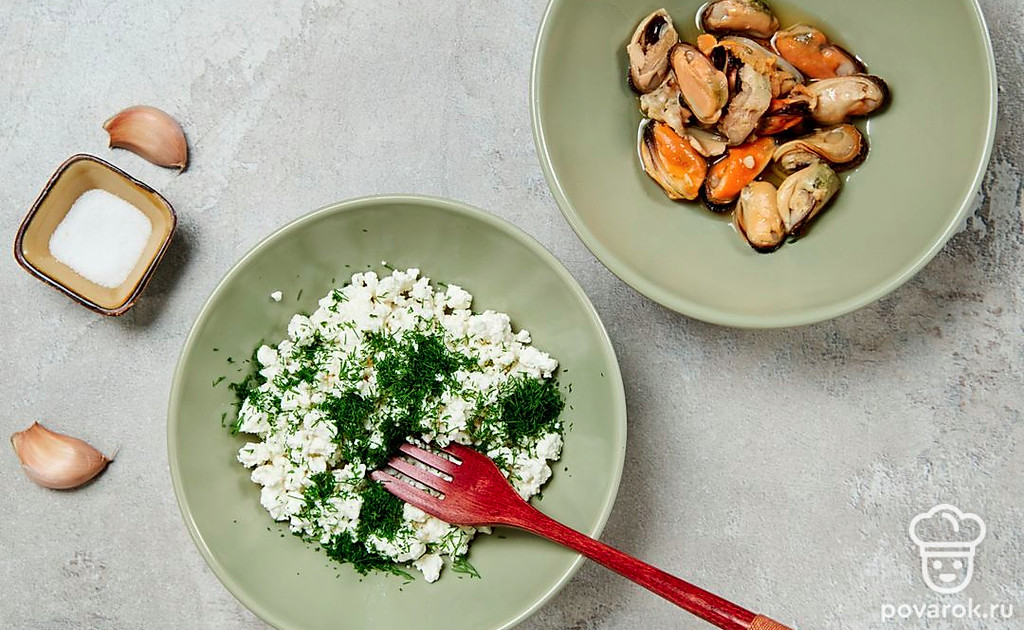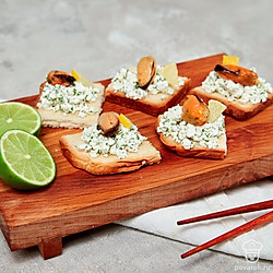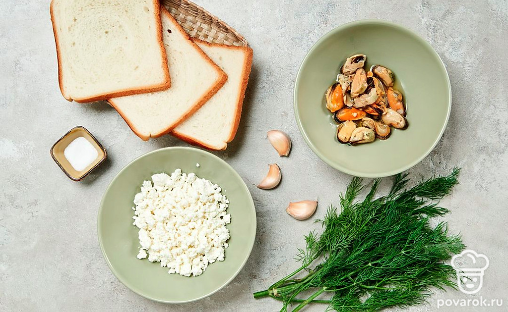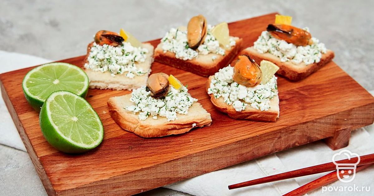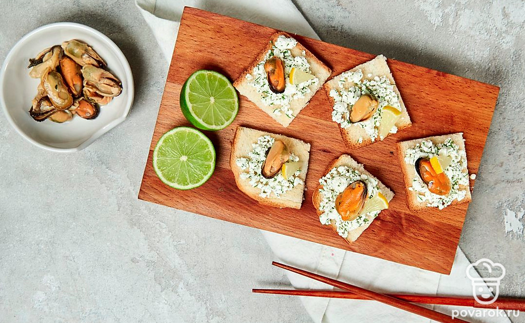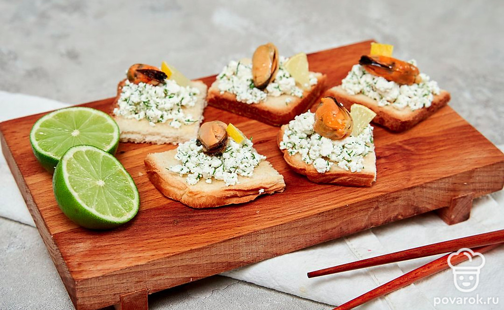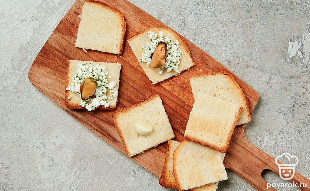 Мидии — аппетитный и ценный для здоровья морепродукт, содержащий в себе селен — один из самых важных компонентов, влияющих на защитную функцию иммунитета. Именно поэтому тост с мидиями получается очень питательным. Вкус моллюска неоднозначный — он колеблется от сладкого к соленому и в каждом блюде раскрывается по-новому. Для удобства процесса мидии возьмите маринованные в масле. Творог в бутерброде, гармонируя со жгучим чесноком, создает приятный вкусовой баланс.
