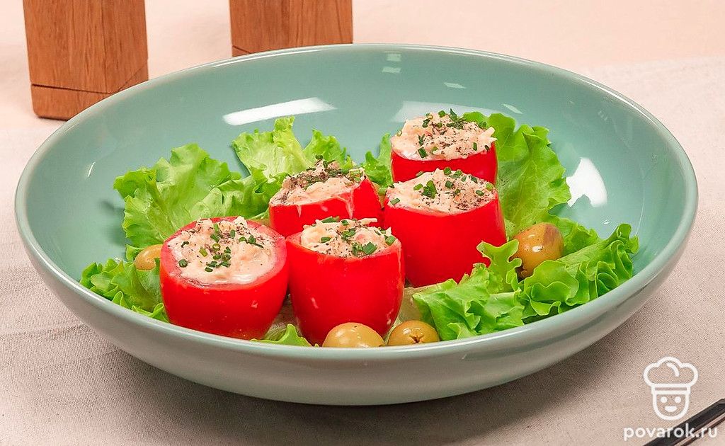 Приготовьте закуску из помидоров с чесноком. Разложите помидоры на блюде. Аккуратно чайной ложкой равномерно разложите по ним начинку. По желанию каждый помидор можно накрыть срезанной верхушкой, чтобы получилась импровизированная "крышка".