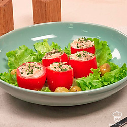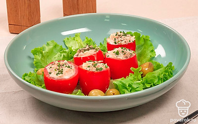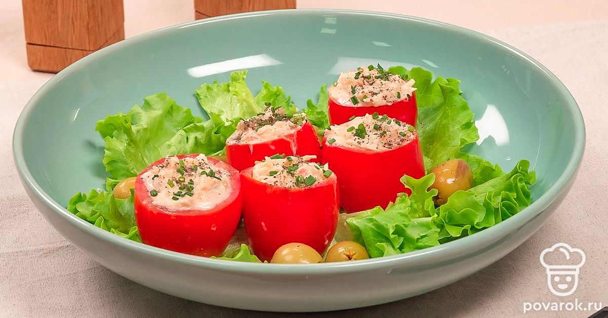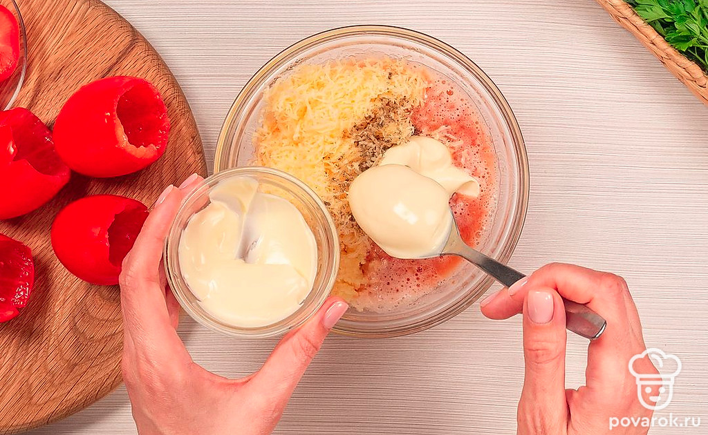 Сделайте начинку. Срежьте верхушку с каждого овоща и аккуратно вытащите мякоть при помощи ложки. Смешайте натертый сыр с измельченным чесноком и мякотью помидоров. Добавьте майонез и перец, а затем размешайте.