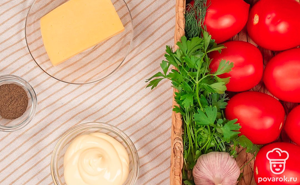 Помойте помидоры, почистите чеснок и пропустите его через специальный пресс. Мелко потрите сыр. Подготовьте плоское широкое блюдо для подачи закуски. Промойте и высушите зелень петрушки и укропа.