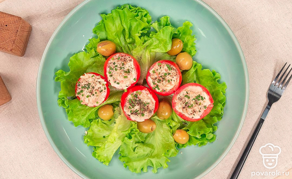Подавайте помидоры, фаршированные чесноком, со свежей зеленью.
