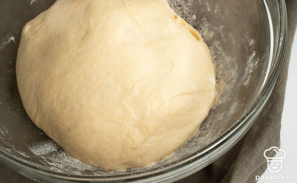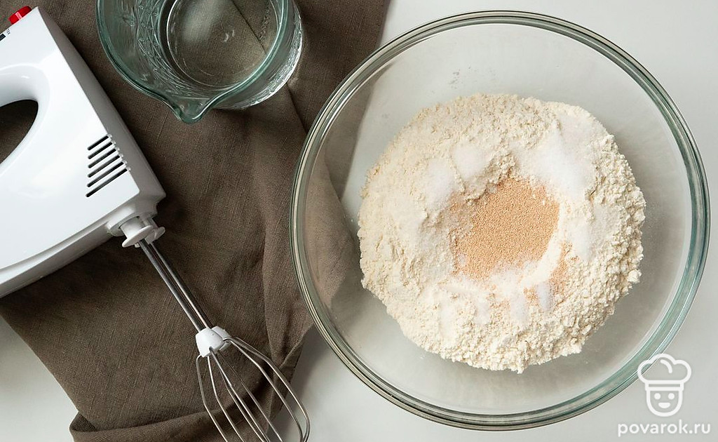 Замесите тесто. Соедините воду и муку. Оставьте смесь на 45 минут, чтобы мука поглотила влагу. Добавьте соль, дрожжи. Размешивайте 8 минут. Лучше это делать с помощью миксера со специальным насадками для теста. Дайте постоять 20 минут.