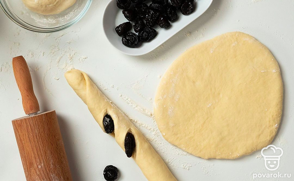 Приготовьте багеты с черносливом. Разделите тесто руками на четыре части. Сделайте шары, из которых потом сформируйте рулеты. Дайте "отдохнуть" 20 минут. После этого каждый рулет растяните в лепешку толщиной 1 см. Заверните в длинный жгут (50-65 см). Противень с пекарской бумагой припылите мукой. Выложите багеты. Оставьте на 30 минут. Сверху сделайте диагональные надрезы, в которые уложите по одному черносливу. Запекайте при 250 градусах 20-25 минут.