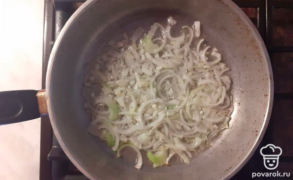 Обжарьте лук и чеснок на оливковом масле в разогретой сковороде.
