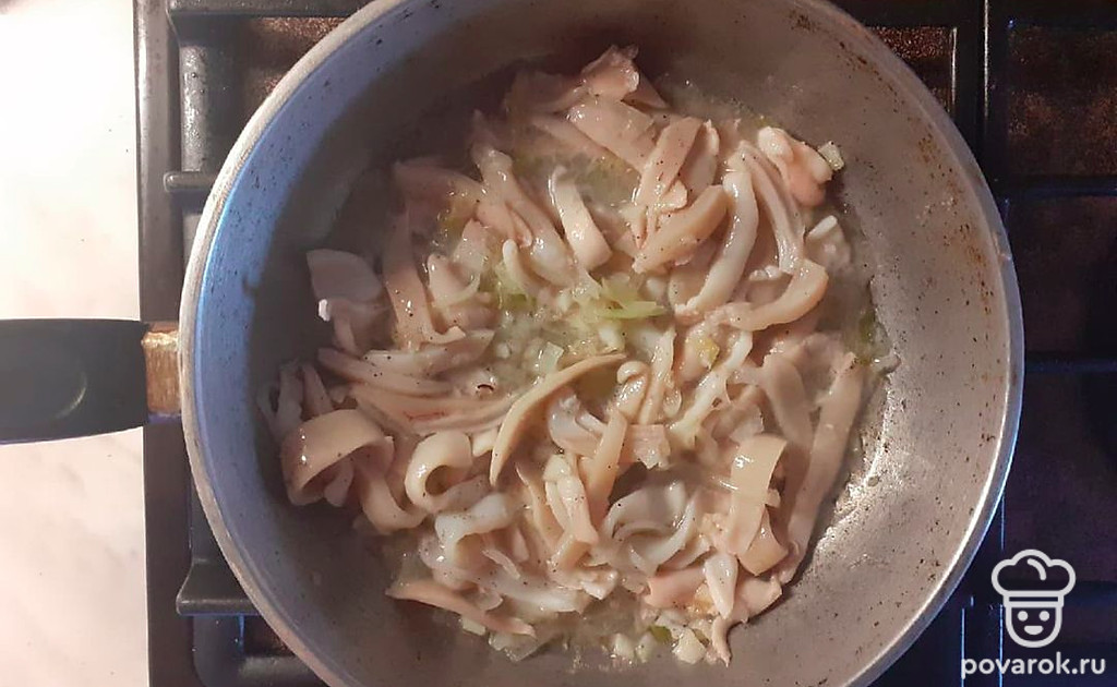 Добавьте нарезаные кальмары. Посолите, поперчите. Обжарьте кальмары с луком и чесноком на сильном огне 2-3 минуты, постоянно помешивайте.