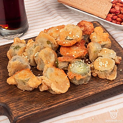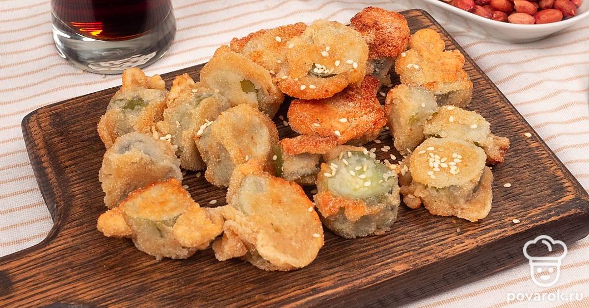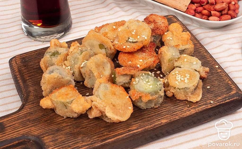 Подавайте соленые огурцы в кляре, посыпав их семенами кунжута.