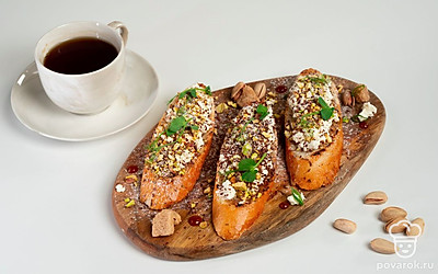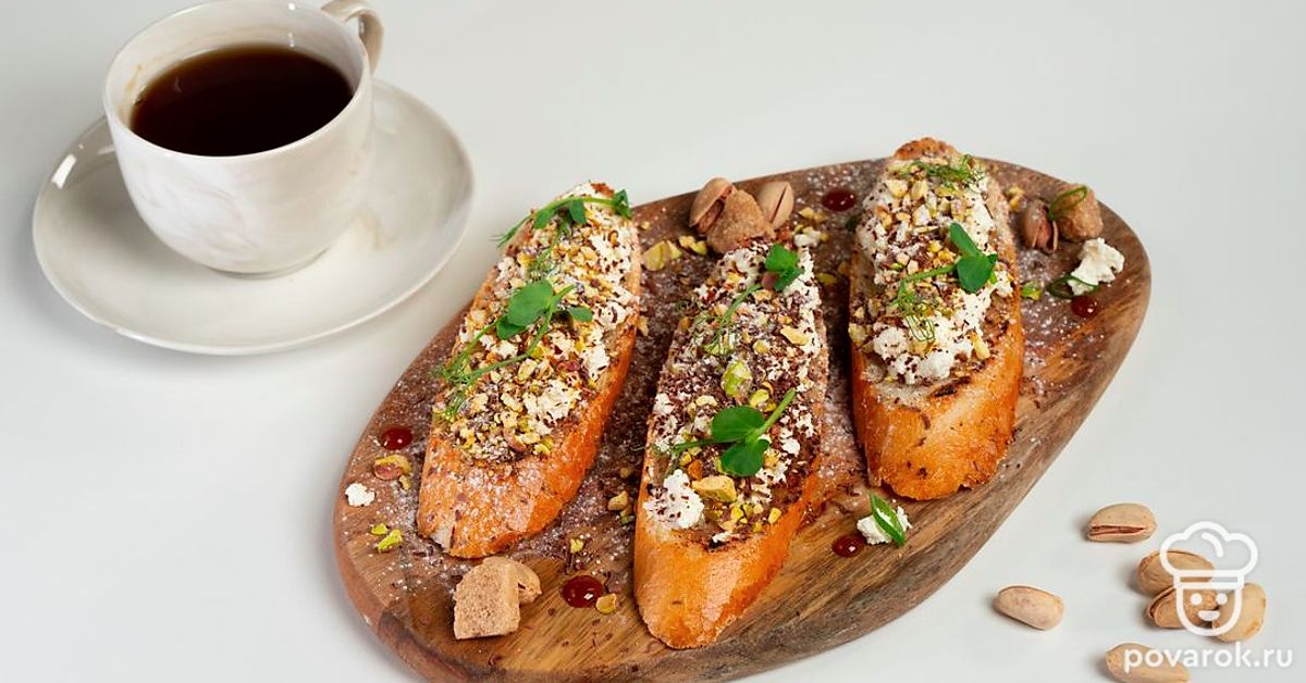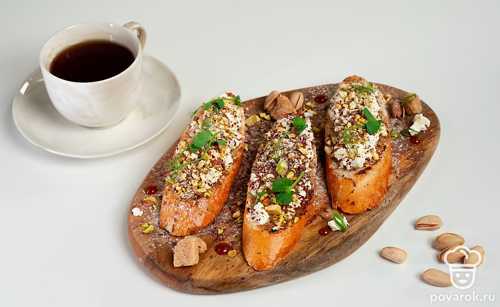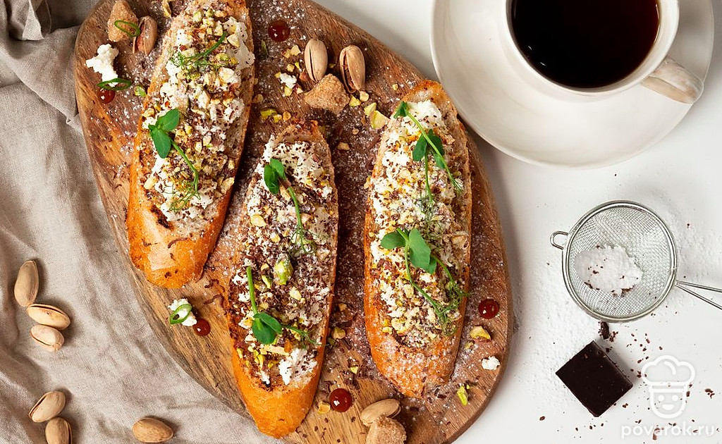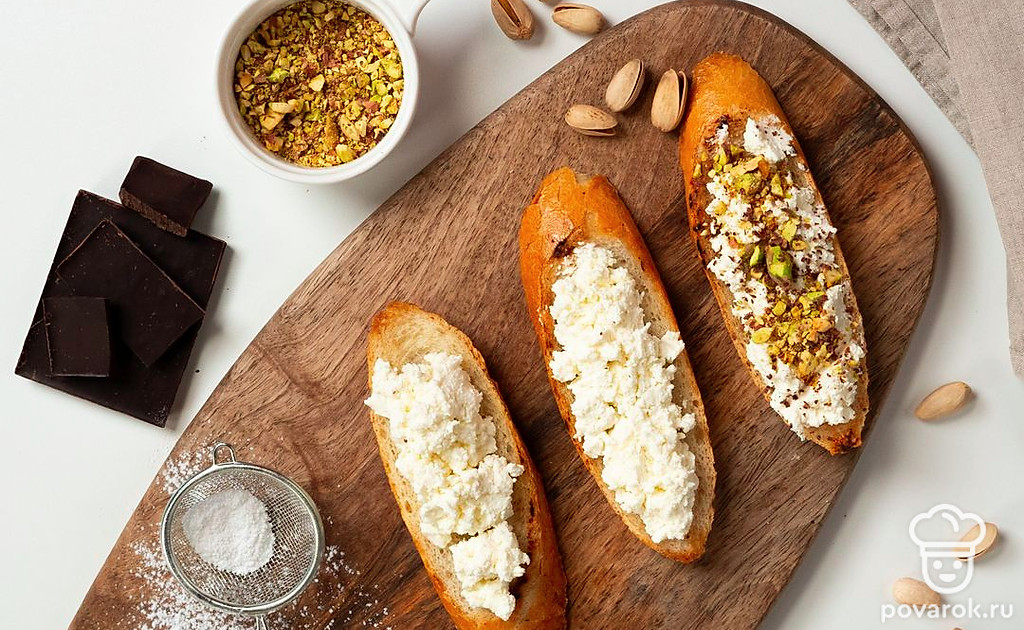 Из багета легко приготовить не только сытные бутерброды, но и вкусный десерт с добавлением фисташек, шоколада и нежного, ароматного крема из сыра рикотта. По этому рецепту лакомство получается хрустящим и питательным. Багет с фисташками можно подать к утреннему или дневному чаепитию.