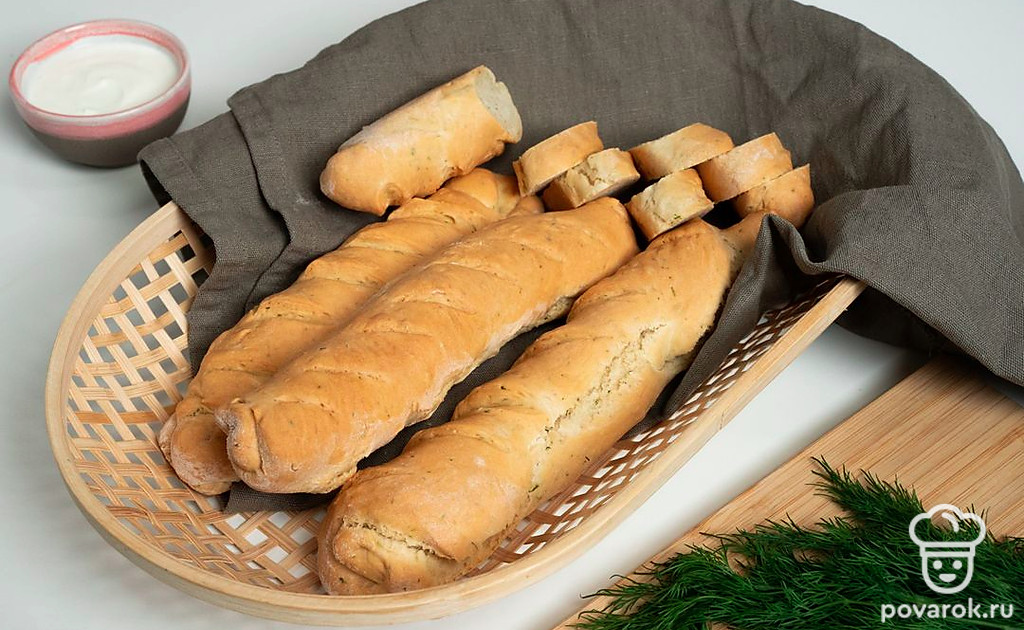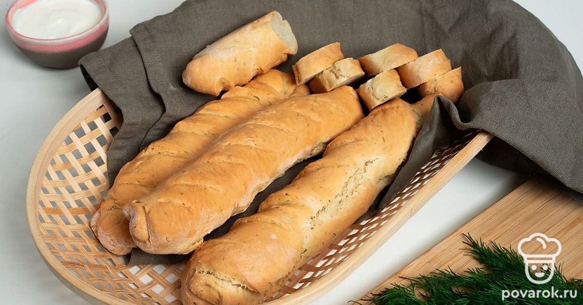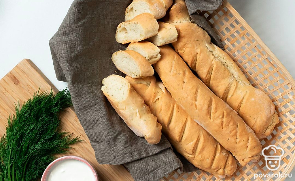 Приготовьте багеты с укропом. Припудрите стол мукой. Выложите тесто. Разделите на 4 части. Каждую из них растяните руками в лепешку. Края сложите к середине и снова растяните в пласт. Повторите еще три раза. Затем придайте тесту форму багета, выложите на противень для запекания. Прикройте полотенцем, оставьте на 20 минут. Сделайте сверху неглубокие разрезы наискосок. Смажьте прохладной водой. Запекайте в духовке при 220 градусах 20-25 минут.